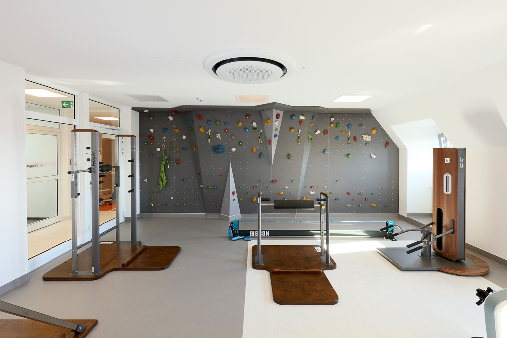 Mehrfache Polygonalstrukturen und bekletterbarer Überhang, verdeckte rückseitige Schwerlastkonstruktion in Brettschichtholz.