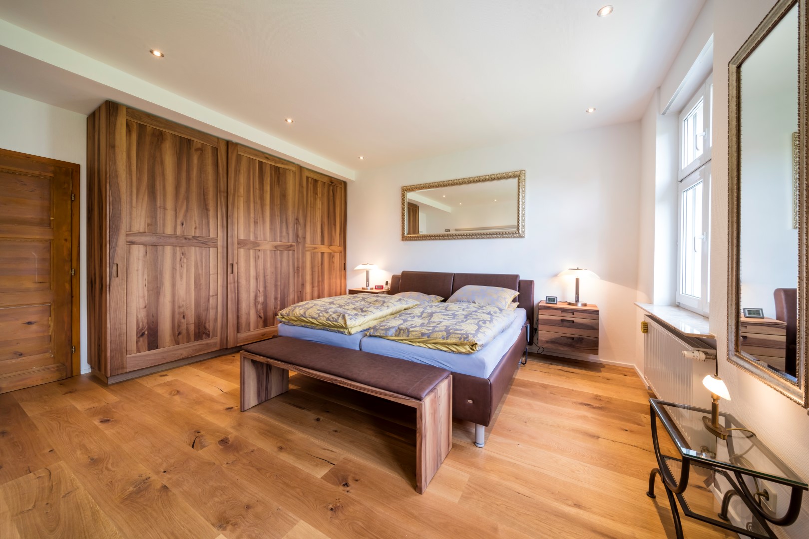 Schiebetürenschrank, Nachttische und Sitzbank in massivem Nussbaum.