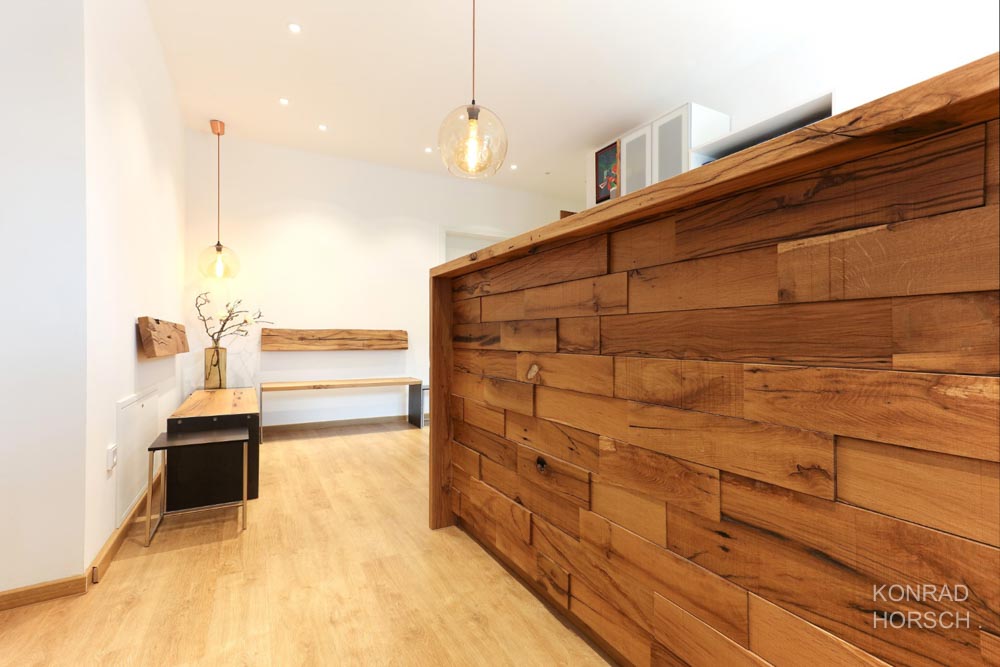 Objekteigenes Altholz im betriebseigenen Sägewerk zerlegt und in verschiedenen Dimensionen in die neugestaltete Praxis rückverbaut. Fotos: Felix Agel / HDAV Multimedia Hagen